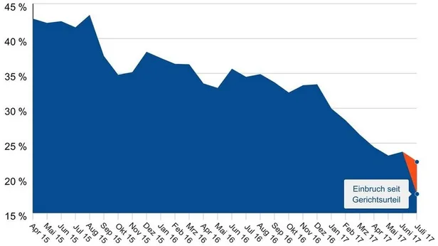 Dit volgt uit een berekening van MeinAuto.de, dat zicht heeft op de dageljkse nieuwregistraties. Het exacte percentage komt uit op 18,3%, vier procentpunten lager dan eerder deze maand. Directe aanleiding hiervoor lijkt de uitspraak van een Duitse rechter vorige week, die een eerder geopperd dieselverbod in de stad Stuttgart bekrachtigde. Als je ervan uitgaat dat de Duitse markt jaarlijks goed is voor 2,5 miljoen nieuwe auto's dan leert een snelle rekensom dat er bij deze cijfers een half miljoen minder diesels op jaarbasis worden verkocht.