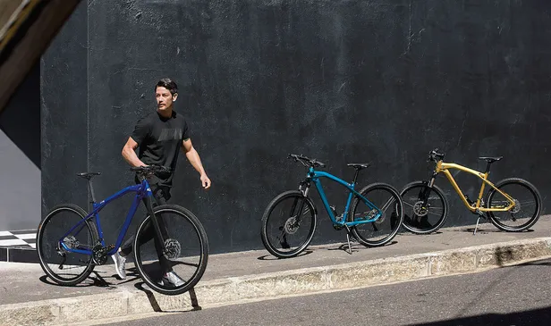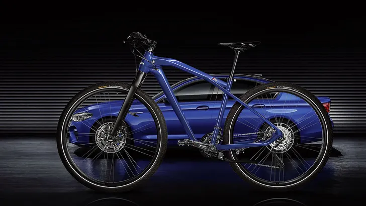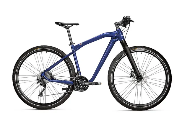 Het frame is een combinatie van carbon (voorvork, zadelpen, spacers) en aluminium; de tweewieler is gespoten in Marina Bay Blue Metallic. Inderdaad, dezelfde exclusieve kleur als op de nieuwe M5. BMW maakt er 500, en net als bij de M5 heeft deze M Bike schijfremmen rondom. Met 28" zijn de wielen wel een stukje groter.
