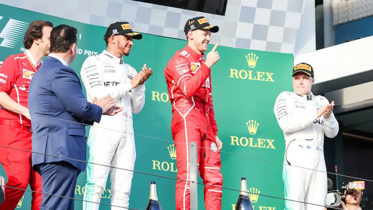 Foto: Vettel (met de kenmerkende vinger), Hamilton en Ray Liotta op het podium na de seizoensopener in Australië.