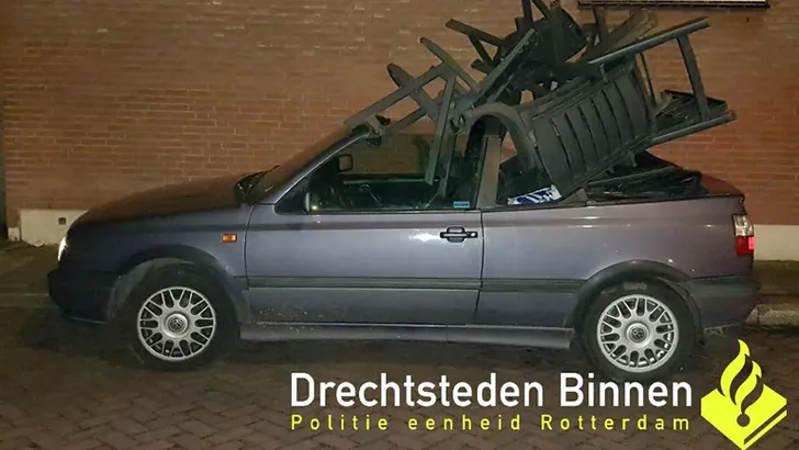 De politie van Dordrecht keek vreemd op toen ze een Golf Cabrio met allerlei tuinmeubels erin zagen rijden. De vervoerder had niet eens de moeite genomen om de stoelen in te klappen voordat hij ermee vandoor ging. Hoe lui kan je zijn? De stapel reikte ver boven en achter de auto uit.
