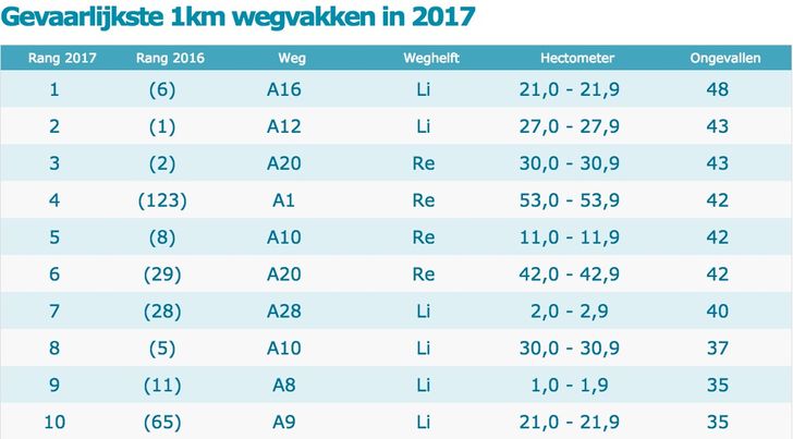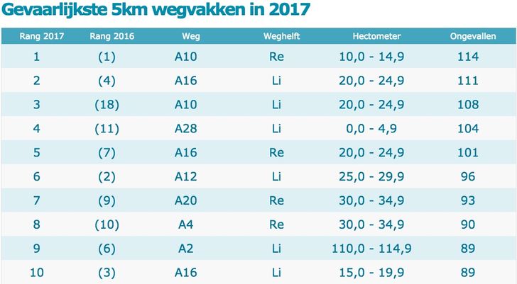 Uit vandaag gepubliceerde cijfers van de Stichting Incident Management Nederland blijkt dat de oostbaan van de Brienenoordbrug bij de oprit Feijenoord het gevaarlijkste stuk snelweg van 2017 was. Tussen de hectometerpalen 21,0 en 22,0 van de linkerbaan van de A16 vonden 48 ongevallen plaats. Hiermee verdringt de A16 de noordbaan van de A12 bij Gouda, die vorig jaar de twijfelachtige eer had bovenaan het lijstje te staan.