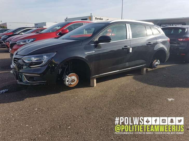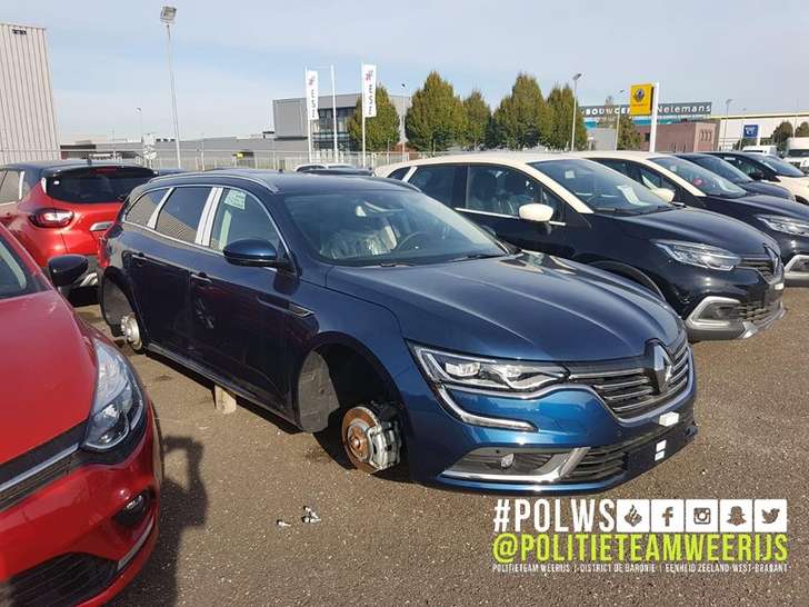 Slachtoffer was dit keer een Renault-dealer in Etten-Leur. Een bakkersdozijn Capturs, Meganes en Talismans werd van hun wiel-bandcombinatie bevrijd en nogal lomp op stenen gezet. Een trieste aanblik, en de daders zijn natuurlijk gevlogen. De wielen verdwijnen ergens in Letland onder een andere auto, en de dealer zit mooi met de gebakken peren. Volgende keer toch maar in een paar slotboutjes investeren? Of een ED-209, da's nog efficiënter. (via)