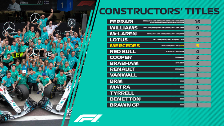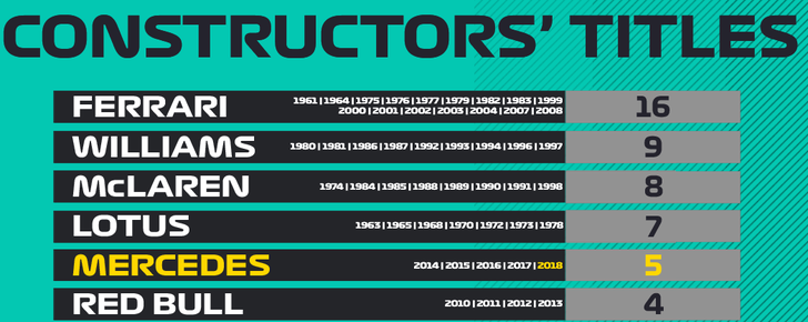Hier een infographic van de F1-organisatie, waar we mooi even op meeliften. Het toont de vijftien constructeurs die ooit een of meer kampioenschappen hebben gepakt. Sinds dit seizoen is Red Bull Racing uit de top 5 geknikkerd, ten faveure van Mercedes. Maar er zijn vier constructeurs die het nog beter deden: Ferrari, Williams, McLaren en Lotus.