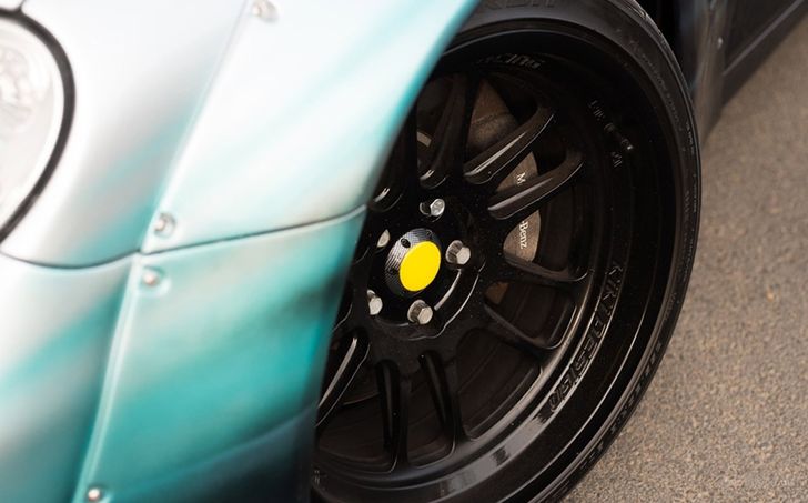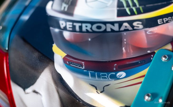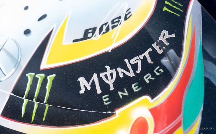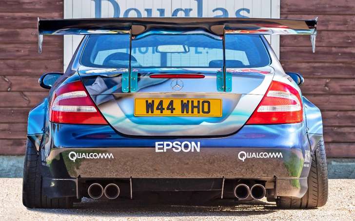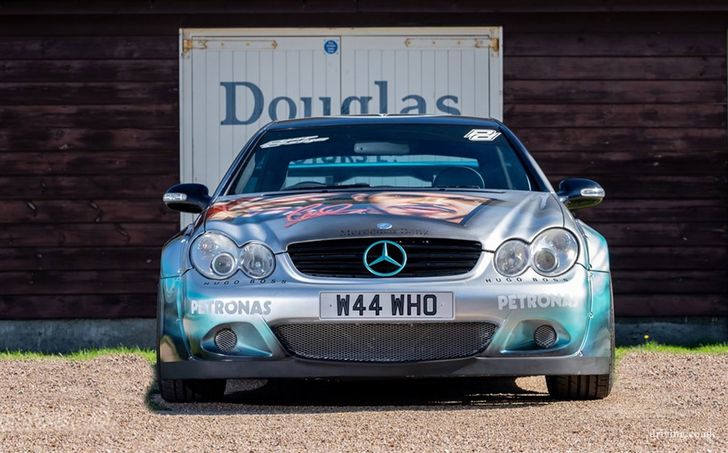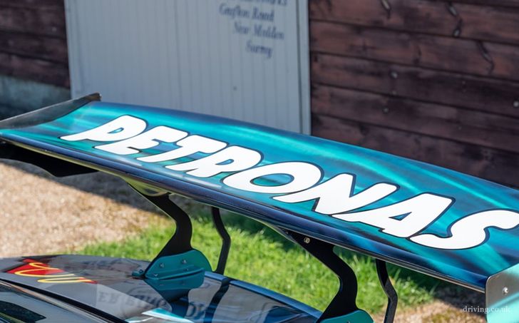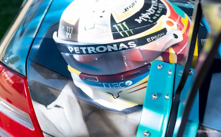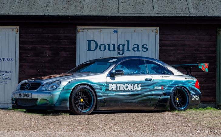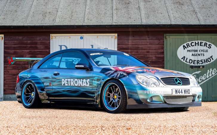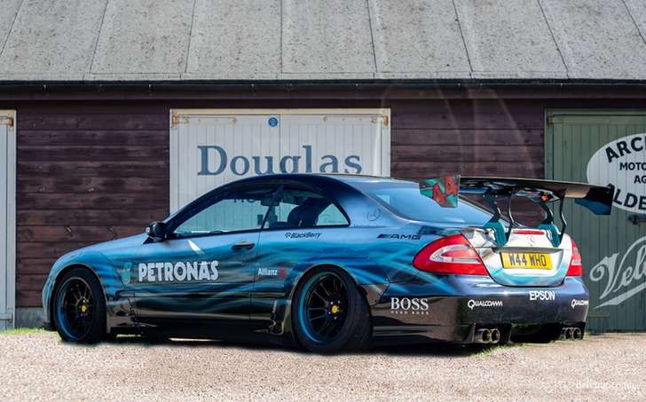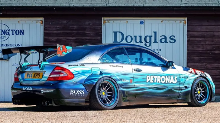 De CLK vol Lewis-fandom is gemaakt door Paul Karslake, een kunstenaar die zich specialiseert in airbrushes en portretten. Naast de bijzondere Petronas-paint job kreeg de Benz serieuze optische tuning mee: een Sarto widebody, een grote spoiler, vier chromen knalpijpen, en een set x-benen op de achteras waar je 'u' tegen zegt. Ondanks al dat negatieve camber valt er nog prima met de auto te rijden, schijnt. Het ding heeft al 81.000 mijl (140.000 km) op de teller staan.