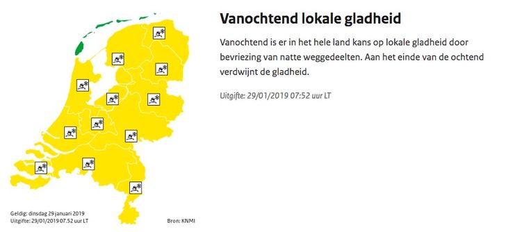 Met een natte weg en temperaturen even onder nul kunt u uw lol op onderweg. Vooral op bruggen en viaducten is het in het hele land oppassen geblazen: het KNMI geeft voor heel Nederland in de ochtendspits code geel af, die geldt tot aan het eind van de ochtend. Hierna verdwijnt de gladheid weer.