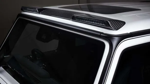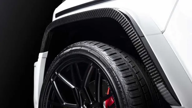 Na de tune-sessie is de auto vijf centimeter breder geworden door de extra brede wielkasten, die ruimte moeten bieden aan de gigantische 23 inch velgen. Daarnaast vinden we rondom bumpers en sideskirts van koolstofvezel en is zelfs de behuizing van het reservewiel in het gewichtsbesparende materiaal uitgevoerd. het geheel is afgewerkt met een lading LED's op het dak.
