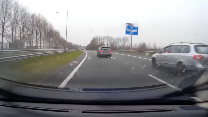 Het overige verkeer rijdt al met aangepaste snelheid. Een Mercedes B-Klasse die de snelheid er al uit heeft, zet zijn knipper uit en gaat meteen naar links. Op dat moment komt onze boy racer met Bill Withers op de stereo met een noodvaart aangesjeest. Hij schrikt, maakt een nogal woeste stuurbeweging tussen twee auto's door, en weet zelf ternauwernood de vangrail te ontwijken. Maar wat een lulhannes om daar zo te scheuren. (via Dumpert)