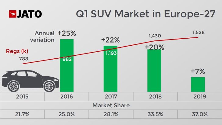De afgelopen jaren ging het hard met SUV's in Europa: onafgebroken werden er groeipercentages van dubbele cijfers genoteerd, en in het laatste kwartaal (Q1 2019) werden voor het eerst meer dan 1,5 miljoen exemplaren verkocht, zo meldt onderzoeksinstituut JATO Dynamics. Dit is het dubbele van de 780 duizend die nog in Q1 van 2015 over de toonbank gingen. Omdat de markt als geheel ook groeide, verdubbelde het marktaandeel niet, maar het steeg wel significant: van 21,7 naar 37,0 procent. Meer dan elke derde verkochte nieuwe auto is een SUV, en daarmee tonen de Europeanen aan lak te hebben aan de goedbedoelde woorden van onze eigen WJ Hilderink.