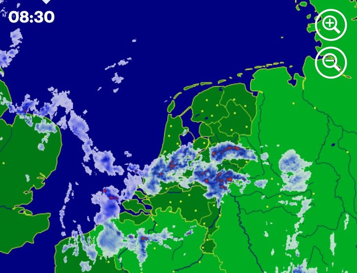 Helaas zijn de weergoden de spits vandaag niet heel gunstig gezind: in de band over het midden van Nederland valt flinke neerslag. Wie na 11:00 uur nog onderweg moet, raden we aan zeker niet de fiets te nemen, dan valt er tot 50 mm per uur. Voor de avond is de spitsverwachting - evenals in de ochtend - 'zwaar'. Dit is de een-na-hoogste categorie.