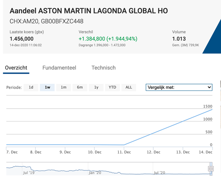 Wat slordig van de banken dat ze niet voorbereid waren op de aangekondigde nieuwe stock split. Wie kijkt in de documenten ziet nu dat Aston Martin ($AMGDF) vanmorgen een reverse stock split met een 20:1 ratio heeft uitgevoerd. In de bankapps van sommige beleggers (dank voor tips) leek het echter op een explosie.