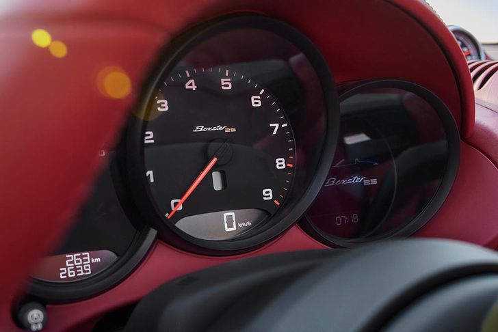 Binnenin is de Boxster bekleed met Bordeauxrood leer. Dat had het studiemodel ook. Het jubileummodel wordt geleverd met een rode softtop waarin de tekst ‘Boxster 25’ is geborduurd.