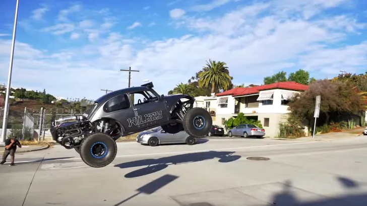 De gewone man zoals Blake Wilkey (27) heeft niet een dergelijk budget, maar wel veel enthousiasme en een buggy met 800 pk op basis van een oude Kever. Dus wat doe je dan: dan improviseer je. Wilkey schoot met diverse maatjes een mooie video die echter vrij onverantwoordelijk is. Het zou ons niet verbazen als de grijze boosmeneer in de video de pliesie belt.
