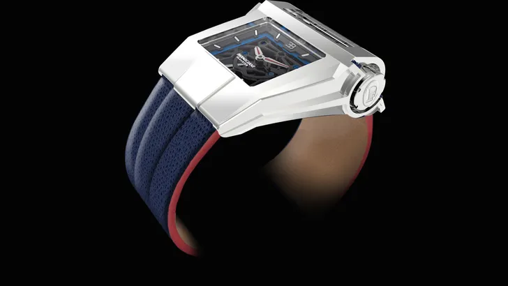 Op de beursstand van Genève konden de lucky few - tussen het in onberispelijk Bugatti-blauw geklede personeel - al even showen met dit nieuwe horloge: