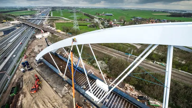 Liefst 255 meter lang, 17 meter breed en 55 meter hoog; de spoorbrug die komende nacht over de weg rijdt is een gigant. Met 8.400 ton schoon aan de haak ook niet bepaald een vedergewicht. Als alles meezit vliegt de mastodont in zes uur over de A1 heen en wordt hij netjes op twee tijdelijke steunpunten. Daar zullen de bouwvakkers het gevaarte de komende maanden afbouwen, voordat hij eind augustus de plek van de oude brug inneemt. Dat afbouwen kan momenteel nog niet gebeuren, omdat de brug dan te zwaar wordt voor de bouwplaats.