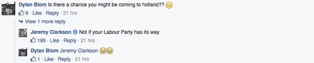Goed, terug naar de PvdA-dis. Herinnert u zich het plan van de PvdA nog om per 2030 alle benzine- en dieselauto's verbannen? Dat nieuws heeft ook Engeland bereikt. En Jezza. Waardoor het nu allerminst zeker is dat 'The Grand Tour' ook naar Nederland komt. (Voor wie op mobiel zit: KLIK HIER.) Thanks, PvdA-Kamerlid Vos.