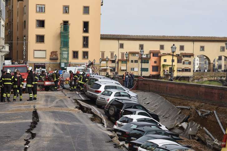 Florentijnen die hun auto naast de Ponte Vecchio hadden geparkeerd werden vanochtend slecht wakker. Een kapotte waterleiding zorgde voor een megaverzakking, maar gelukkig spoelde het blik niet linea recta de Arno in.