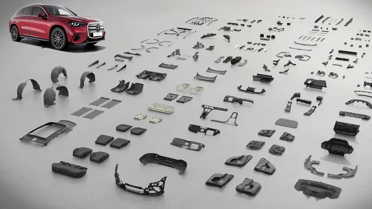 Mercedes Benz heeft in totaal ruim 61 kilo aan gerecycled plastic in de auto verwerkt. De meest opvallende toepassing daarvan vinden we onder de auto. De bevestigingspunten waar je de krik onder plaatst in geval van pech, zijn voor de volle 100 procent gemaakt van omgesmolten bumpers van oude sloopauto's. Ook de bagagebak voorin de auto, de zogenaamde frunk, bestaat voor de helft uit gerecycled consumentenafval.