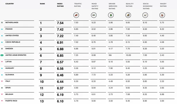 Natuurlijk, Nederlandse wegen zijn dikwijls in uitstekende staat. Maar ze staan ook vaak vast. Dus dat schiet nog niet op. Bovendien is Puligny-Montrachet in Nederland goedkoper dan benzine. Hoe komt Nederland dan toch aan zo'n hoge notering? Kijkt u even naar onderstaande ranking en de manier waarop die wordt samengesteld.