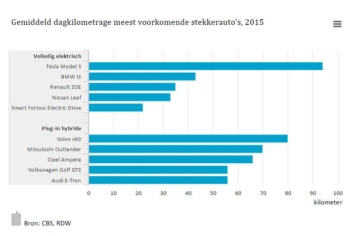 Dit laatste mag geen verrassing zijn, met een Tesla hoef je niet na elk ritje aan de lader, en de ruime elektrische range zal voor veel rijders - die hun Model S in 85% van de gevallen zakelijk rijden - doorslaggevend zijn geweest. Gemiddeld rijdt een Nederlander 94 kilometer en een dag in zijn Model S (4,4 duizend exemplaren). Tweede op ruime afstand is de BMW i3 (1,6 duizend exemplaren) met 43 km.