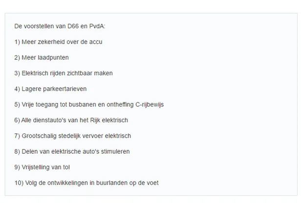 Enfin, de volelektrische auto profiteert momenteel van een belachelijk lage bijtelling (4%) en per 1 januari 2017 van een gereduceerd stroomtarief. Daarnaast moeten er volgens het plan de volgende dingen gedaan worden vanuit de overheid (we citeren de NOS even):